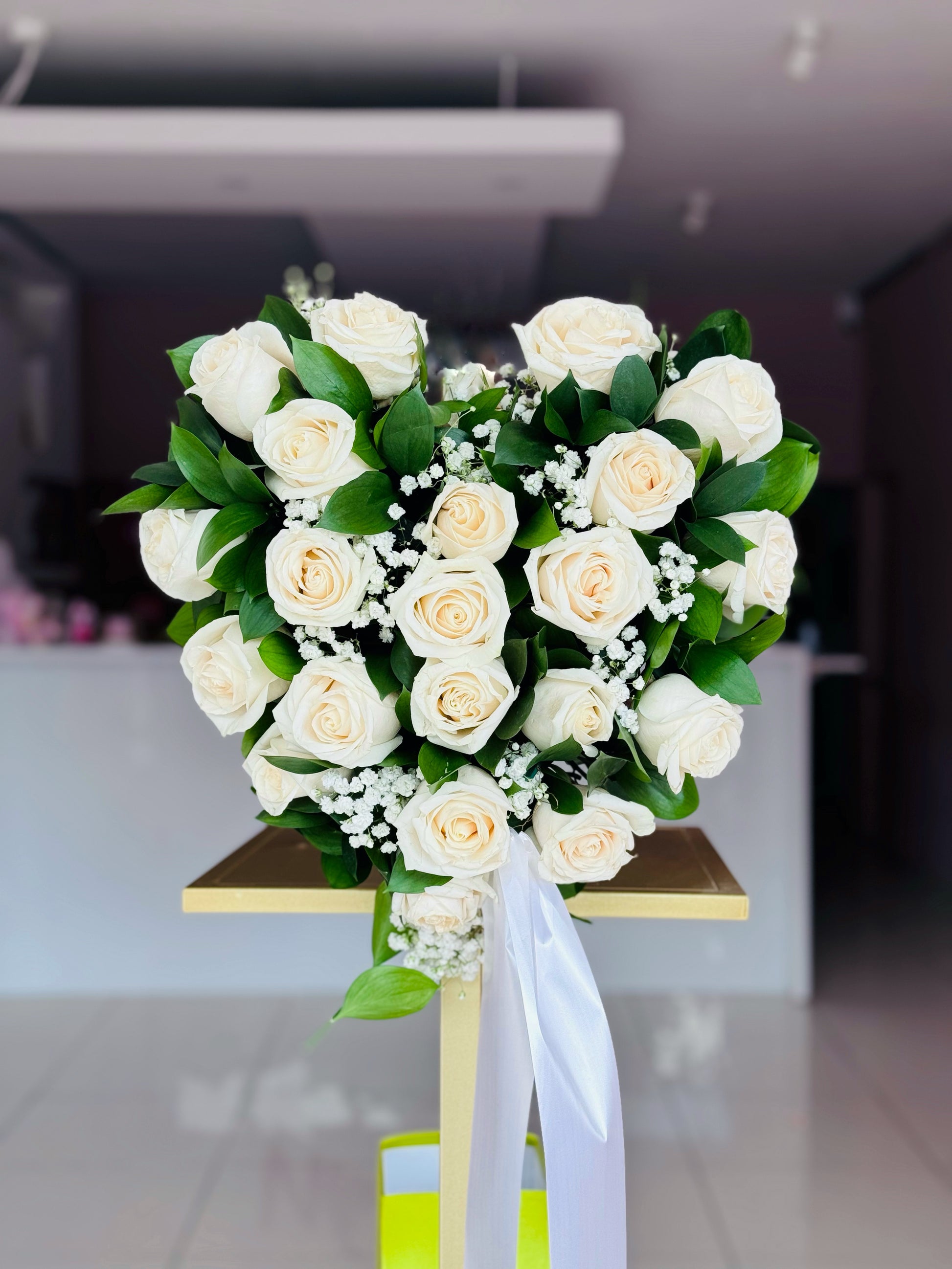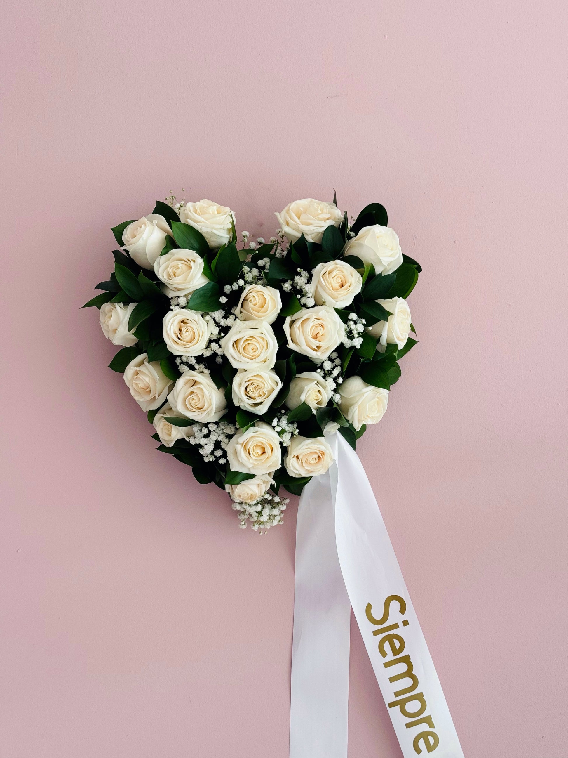 Arreglo fúnebre en forma de corazón de rosas blancas y follaje